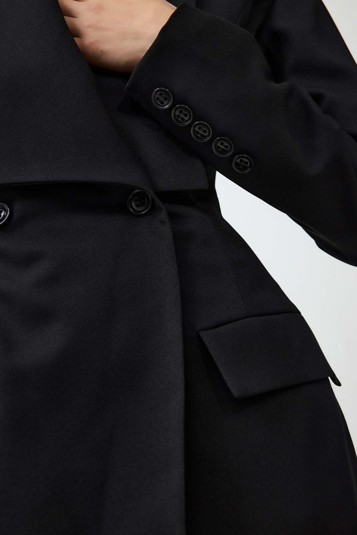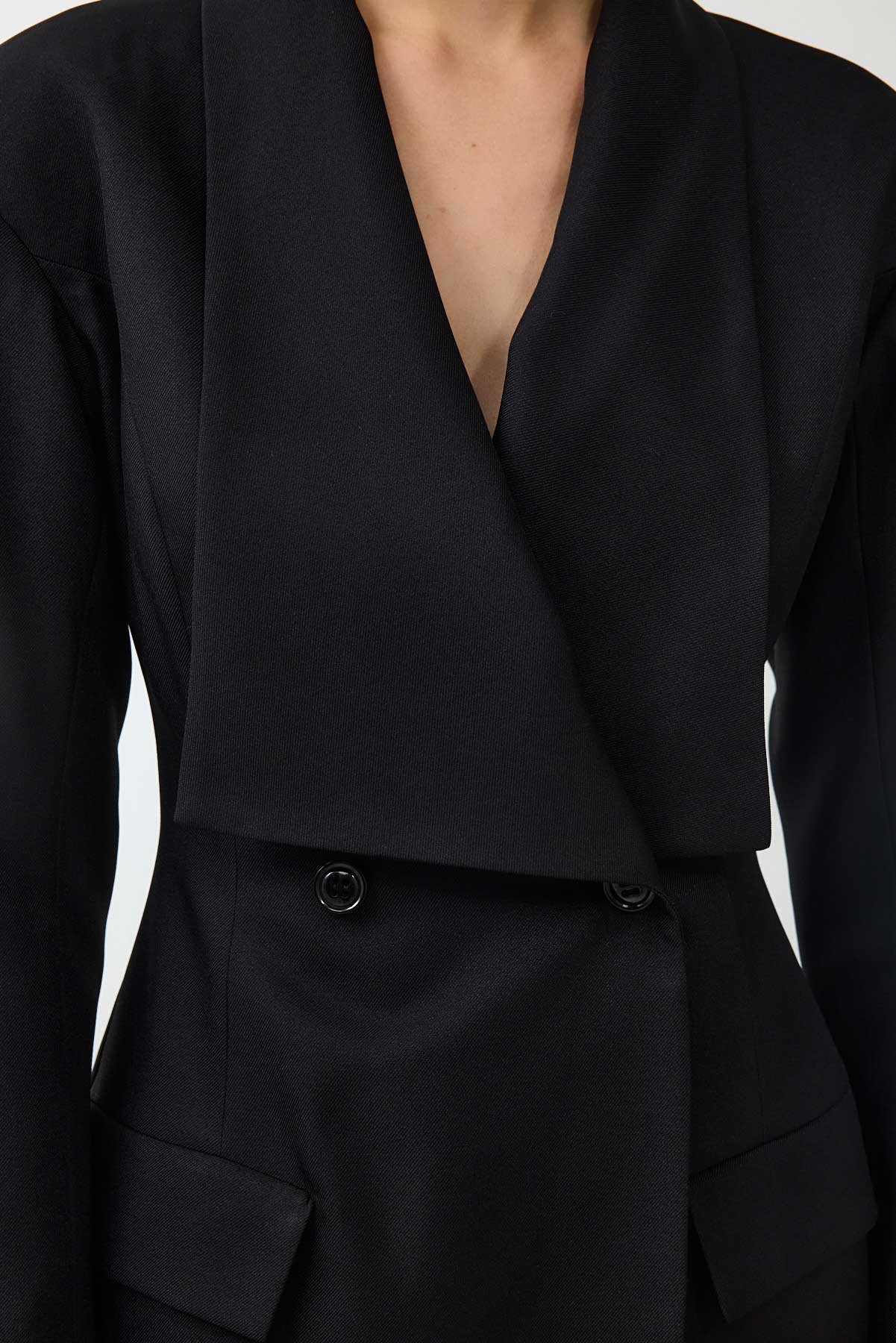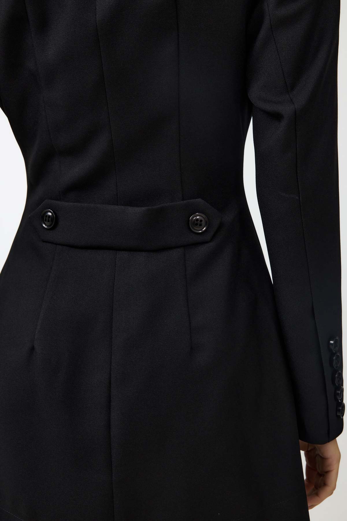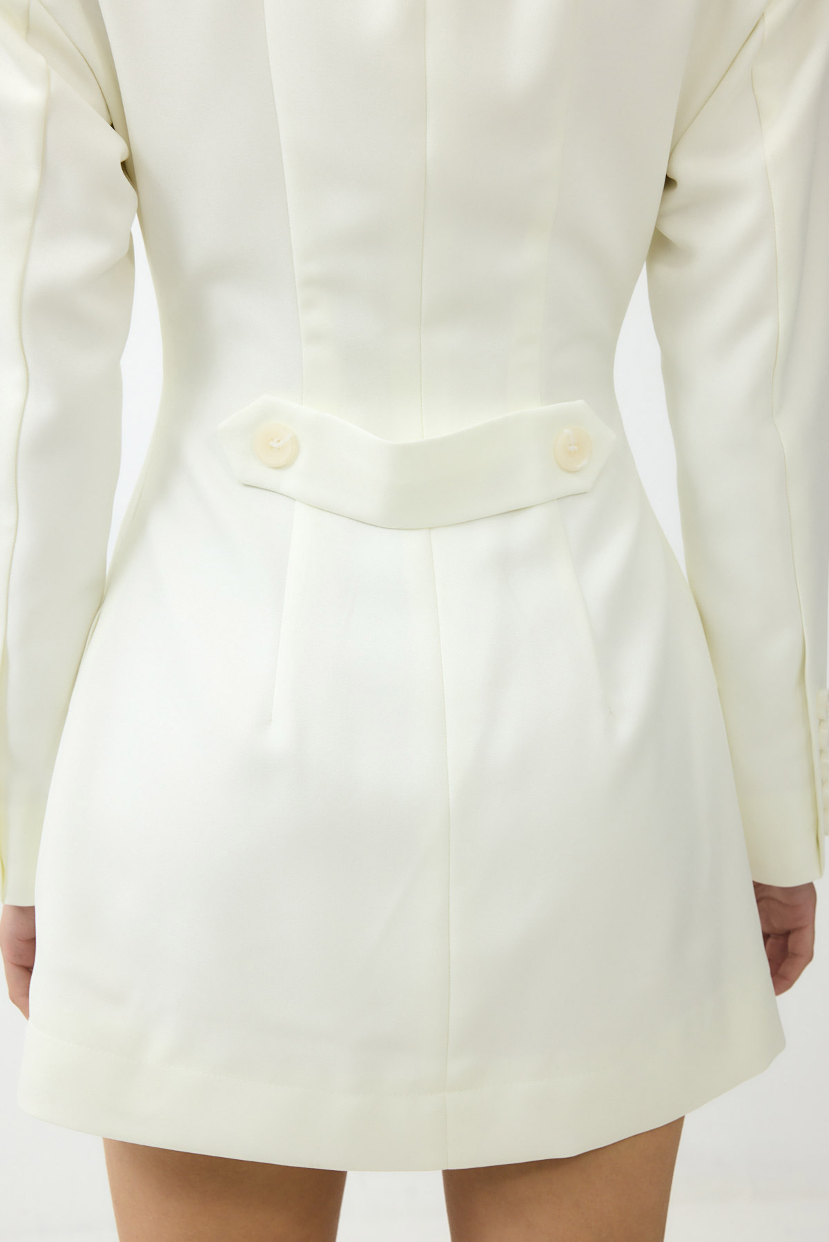 שמלת ג'קט שמשדרת נשיות עוצמתית. כתפיים רחבות וחזקות נפגשות עם מותן צרה ומעוצבת – סילואט שלא מתנצל על עצמו. המחויטות הגברית מתרככת בצווארון נשי גדול, יוצרת דיאלוג מרתק בין חוזק לעדינות. זו שמלה למי שיודעת מה היא רוצה ולא מפחדת להגיד את זה.