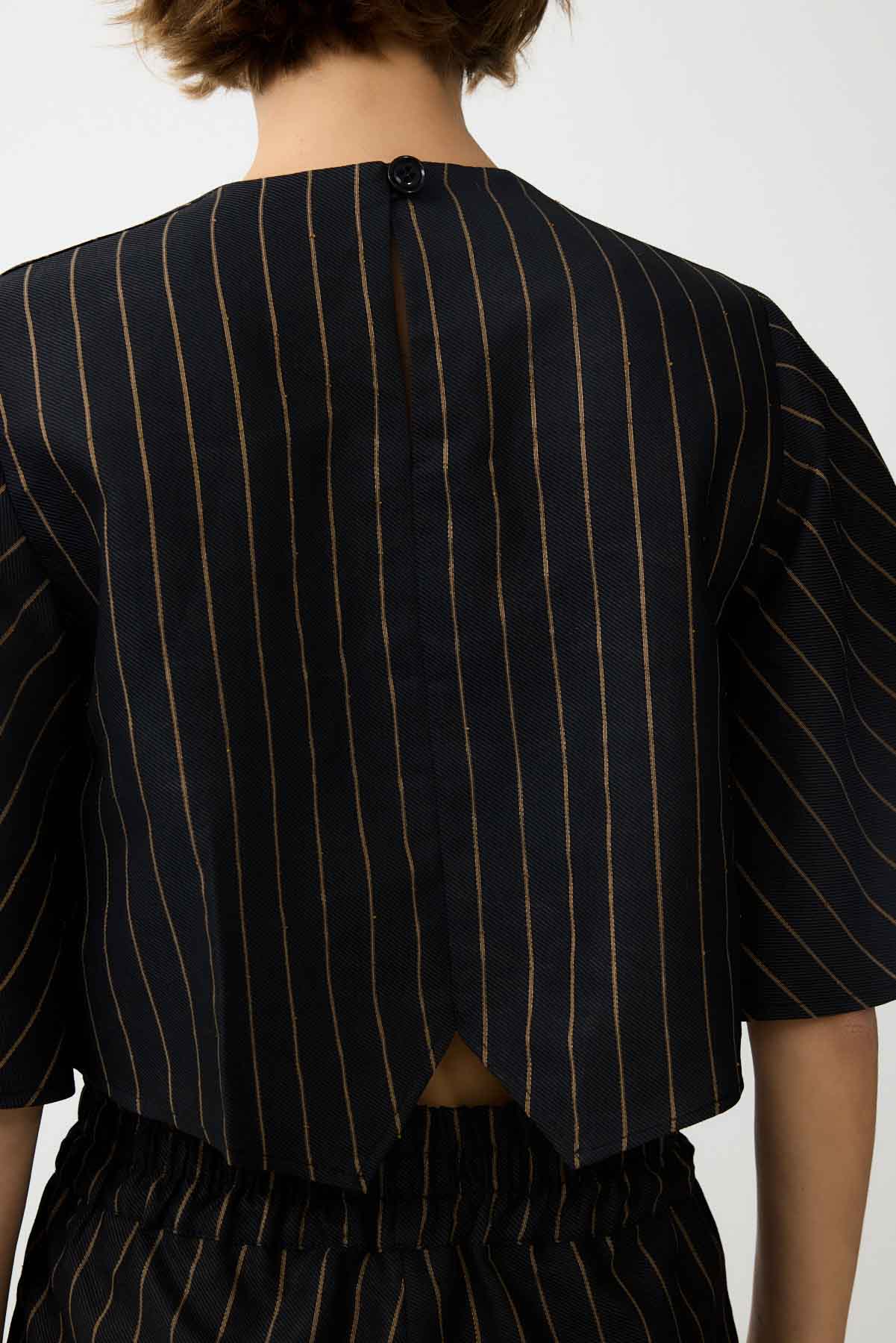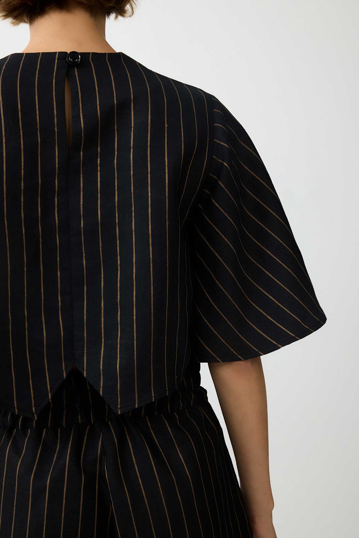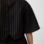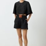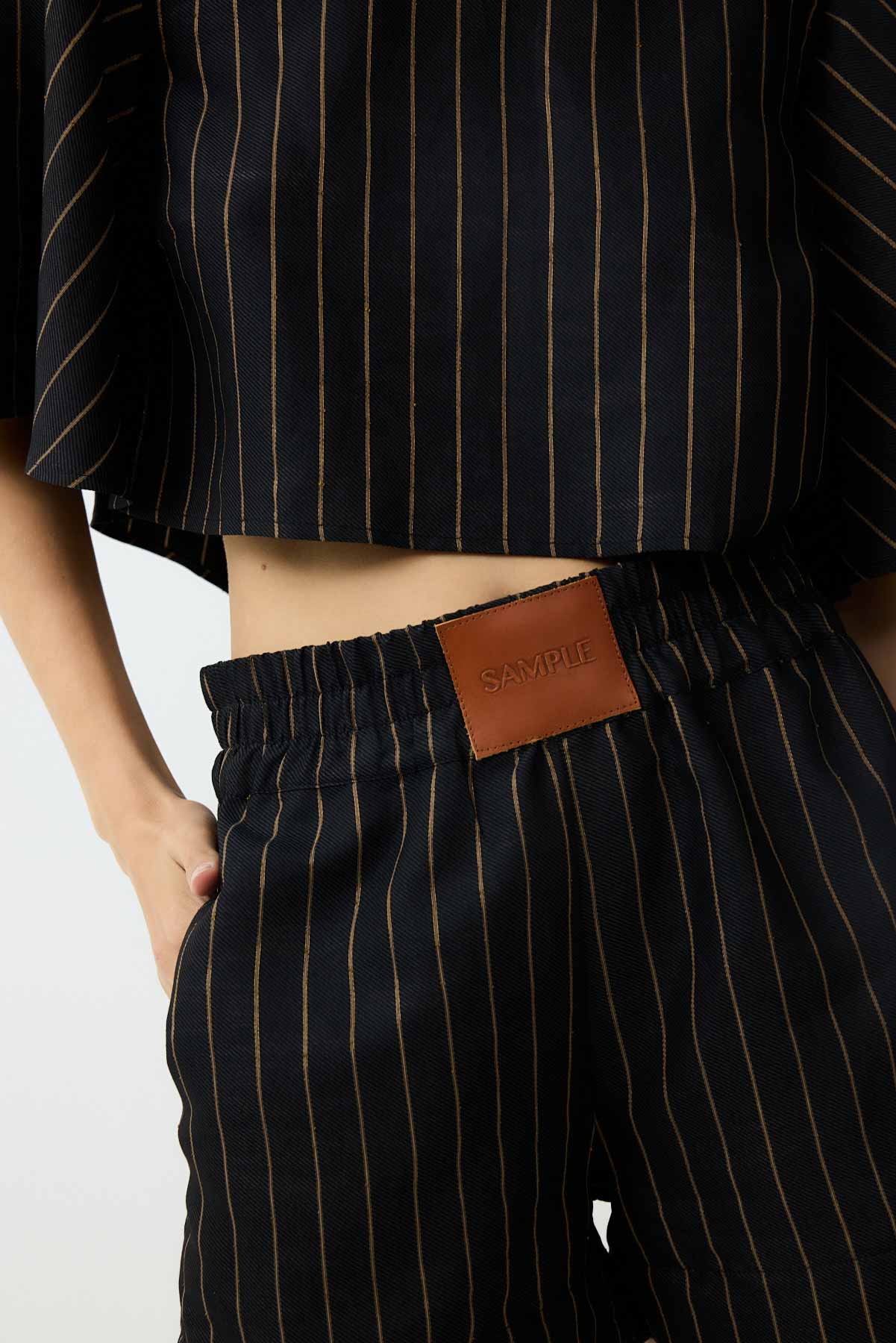 Black linen shorts suit with brown stripes – light and comfortable for everyday wear.Quality brown leather detailing with our logo adds that special touch. Wearing the leather label with “Sample” is making a statement and committing to be an example for your environment.