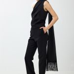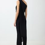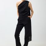 One-shoulder jumpsuit sculpted to the body with small fabric layers around the chest and waist – flattering your figure while giving freedom and breathing space. The largest layer turns into a delicate scarf that drapes down the back, ending in shimmering fringe.