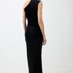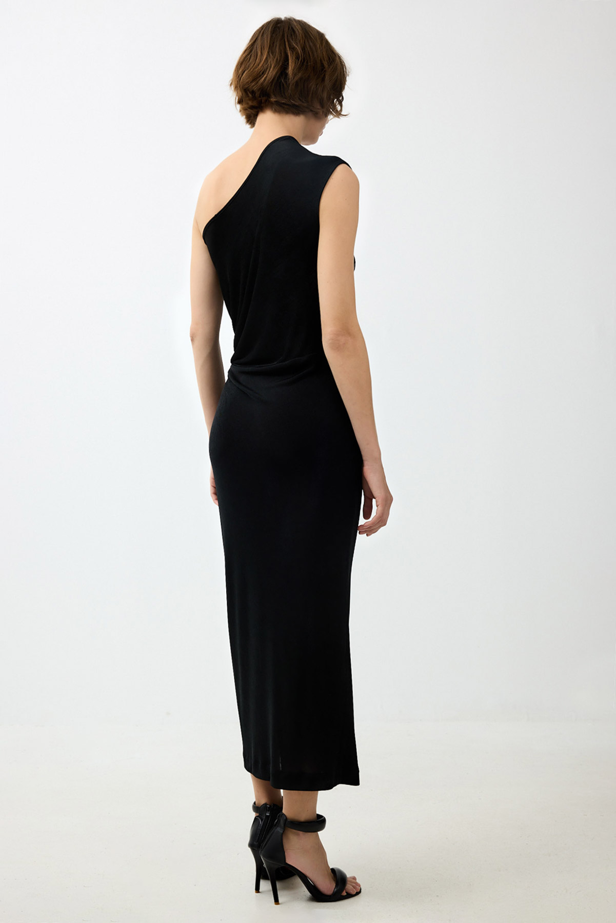 Midi evening dress in thin, stretchy fabric. It wraps around the body smoothly, gathering from the center and flowing around. A snake-shaped buckle captures and centers all the fabric to one point, leading to a deep, sexy slit.