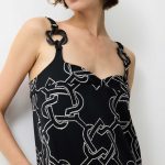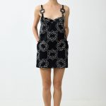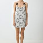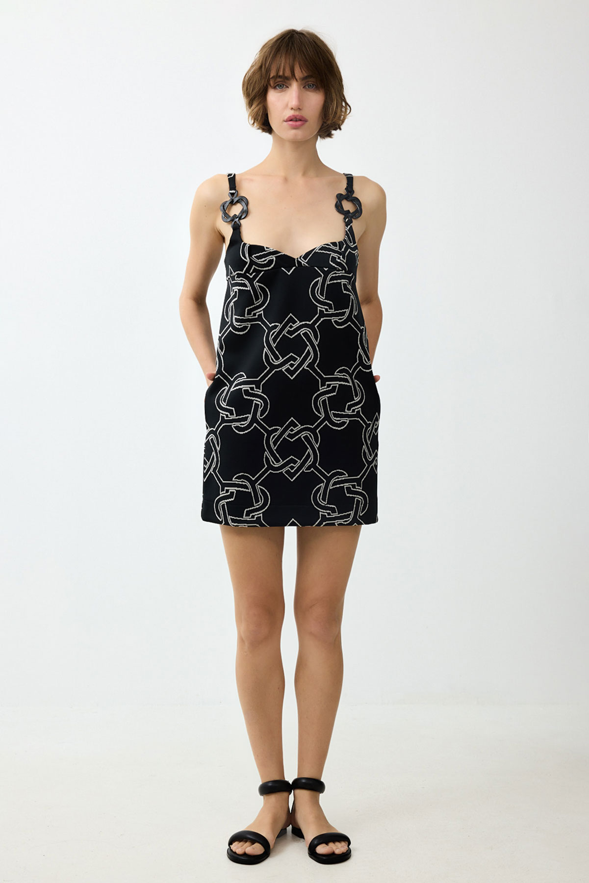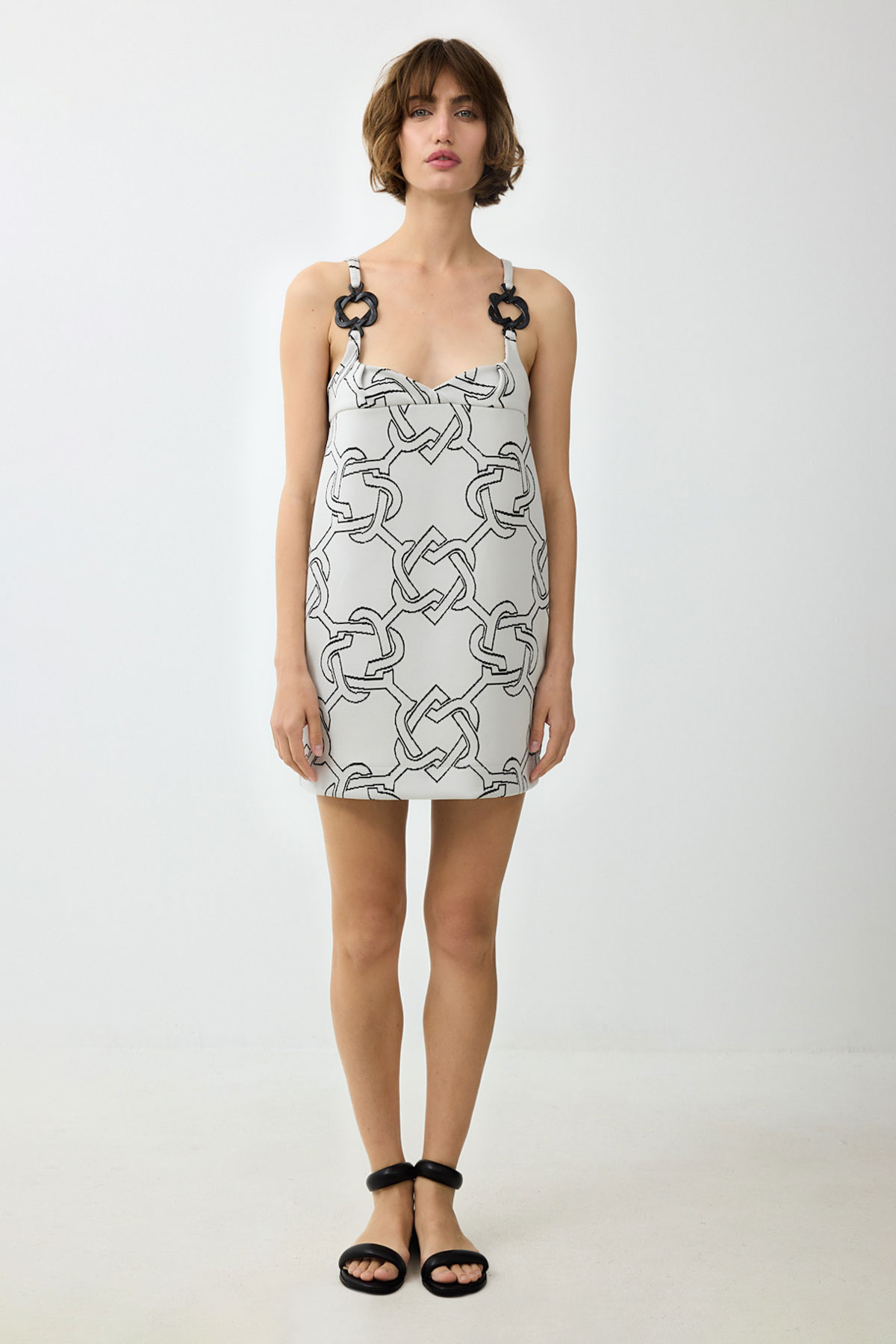 Short dress inspired by Leonard Cohen’s Star of David – composed of two hearts that were connected into chains in delicate jacquard weaving, with matching buckles that complement the unique pattern. A relaxed and light dress that effortlessly transitions from day to evening.