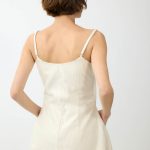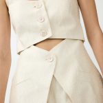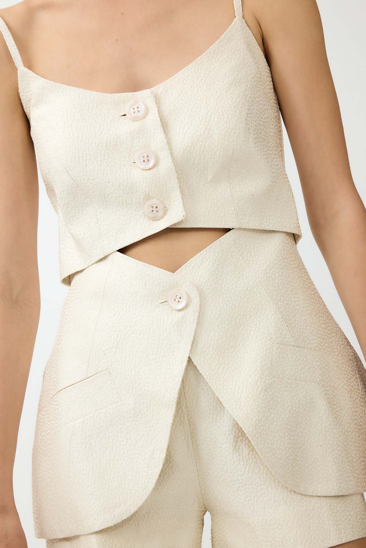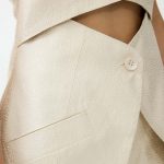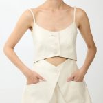 Summer silk suit in pale pink with large buttons and a small waist opening that plays between revealing and covering. The top covers almost all of the pants, blurring the lines – part top, part dress. Everyday elegance that effortlessly transitions from day to evening. The pale pink adds a touch of soft delicacy to the sophisticated style.