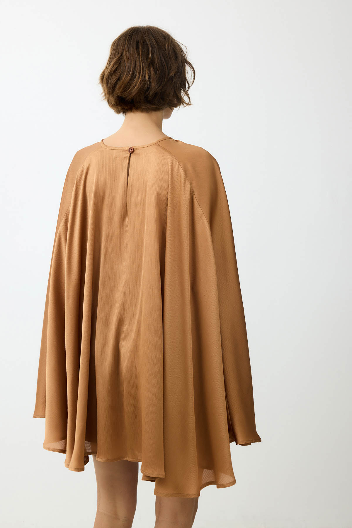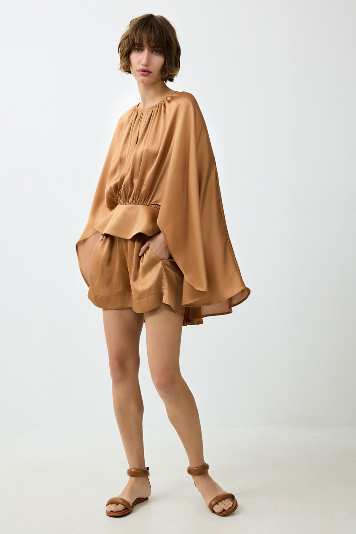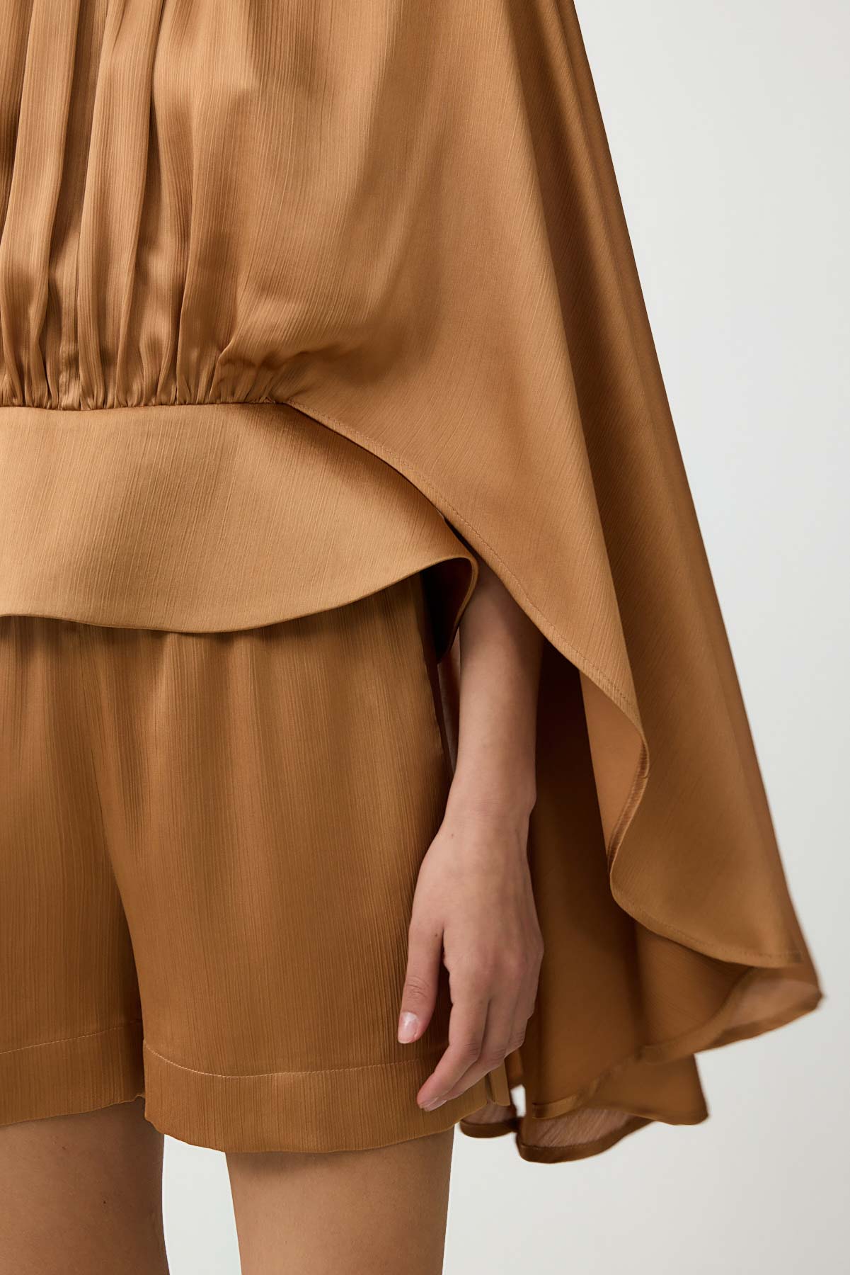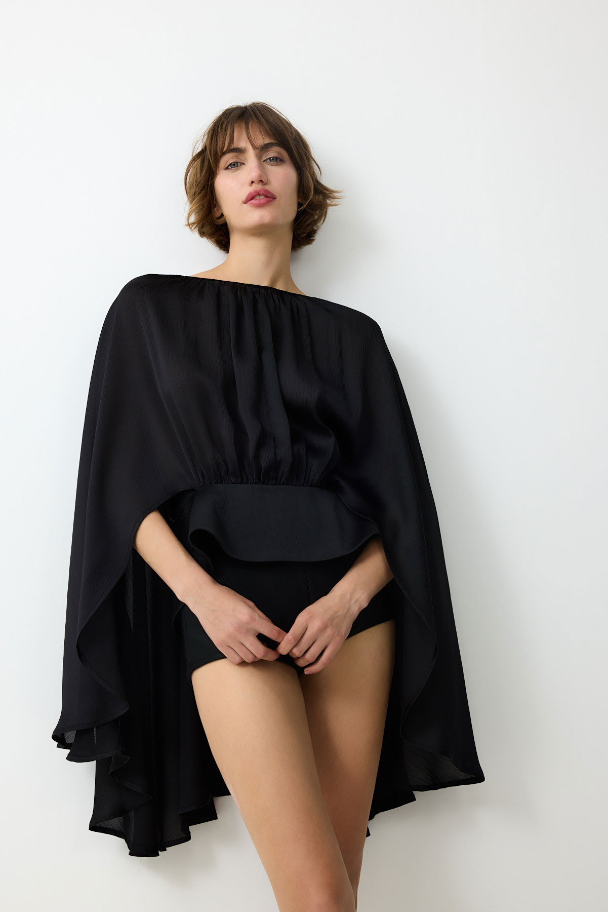 A cape-style top in thin, shimmery fabric. The fitted waist hugs the body creating a tailored look, while the soft cape drapes beautifully over the shoulders. Perfect for day or evening