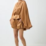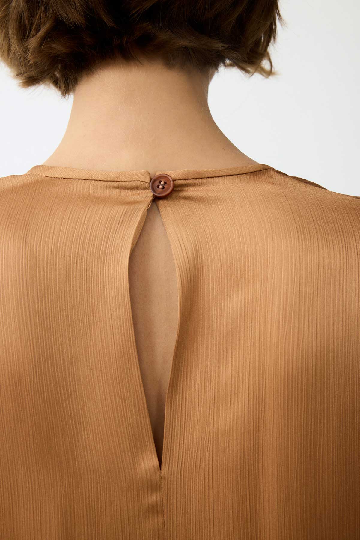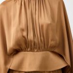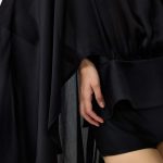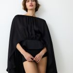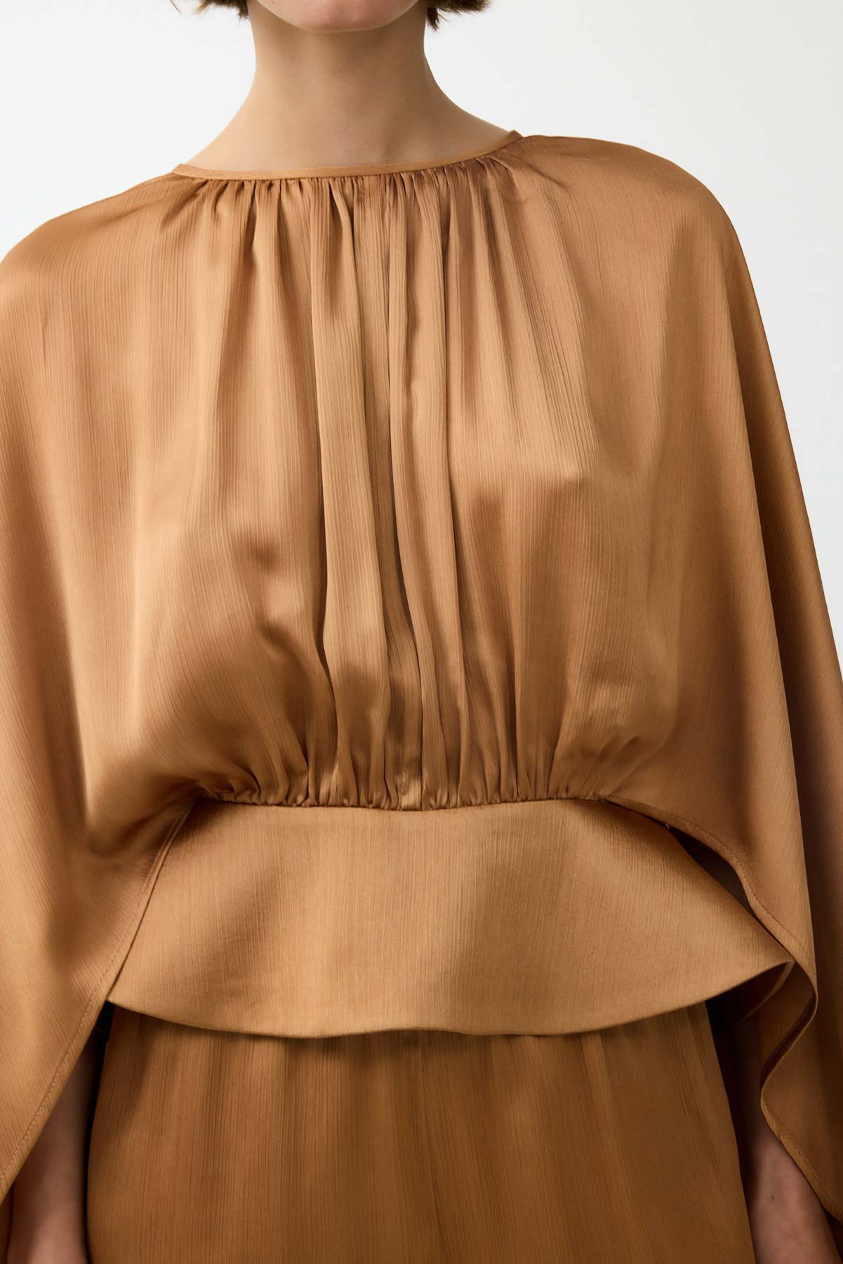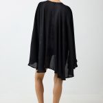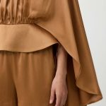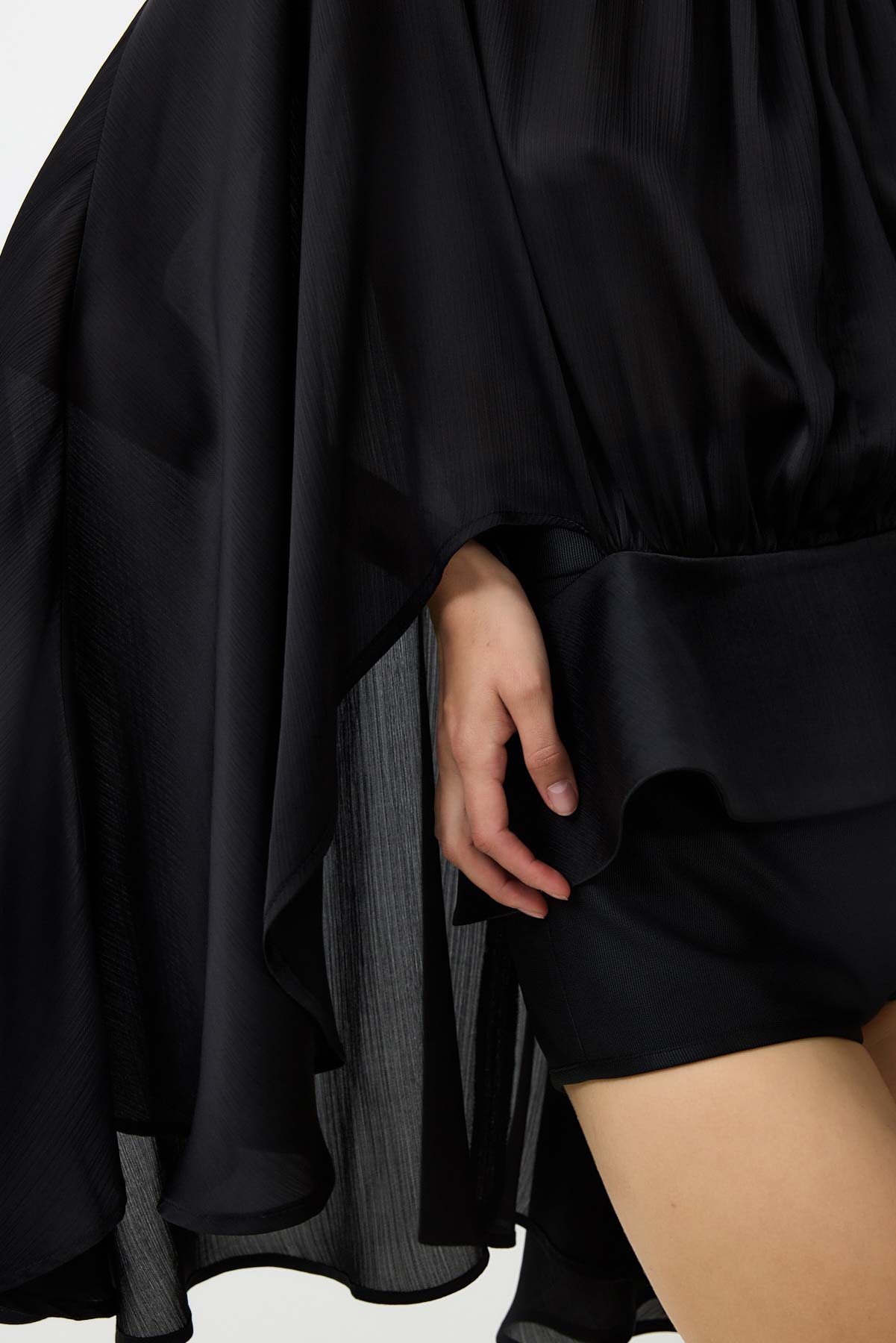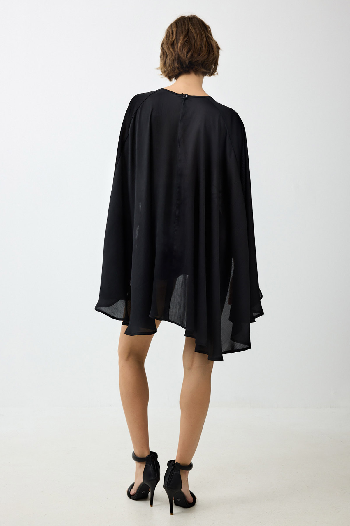 A cape-style top in thin, shimmery fabric. The fitted waist hugs the body creating a tailored look, while the soft cape drapes beautifully over the shoulders. Perfect for day or evening