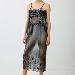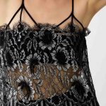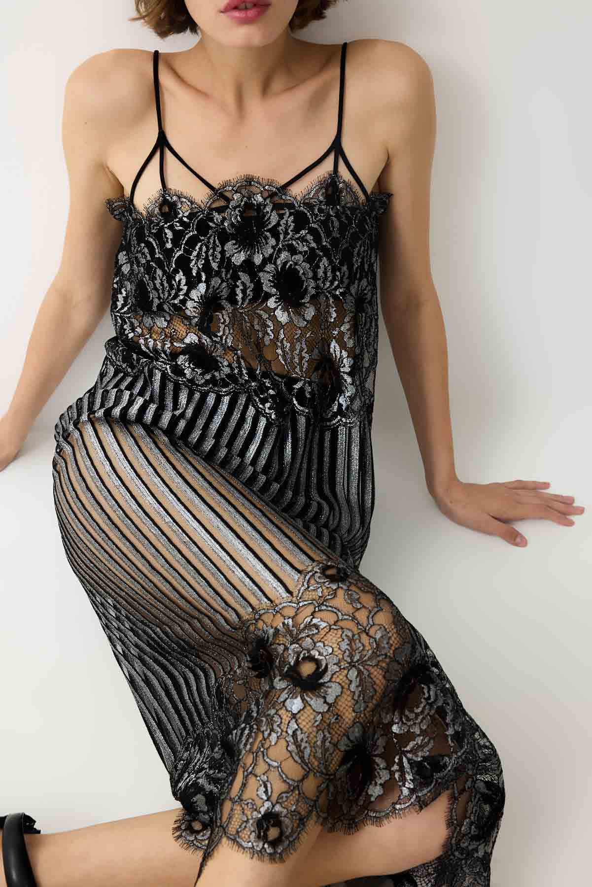 Straight dress in elegant black lace with silver thread woven throughout. Straps borrowed from the lingerie world break the expected elegance and create a bolder, sexier look. The completely transparent dress leaves the choice to the wearer – what to reveal and what to cover . The tension between elegance and boldness is exactly the point.